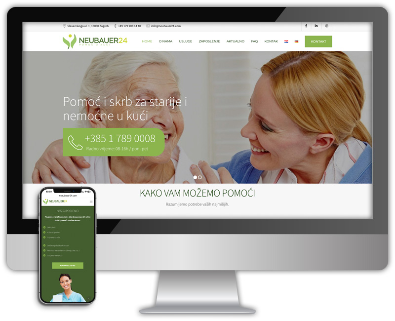 Neubauer24 Doo iz Zagreba je kompanija specijalizovana za privatnu negu starijih osoba. Napravili smo višejezičnu veb stranicu za ovog klijenta koji posluje na hrvatskom tržištu. U projektu je bilo veoma važno da veb stranica pruža informativnost za potencijalne kupce/pacijente sa nemačkog i austrijskog područja, a isto tako da bude reprezentativna za potragu za novim radnicima u zemlji.